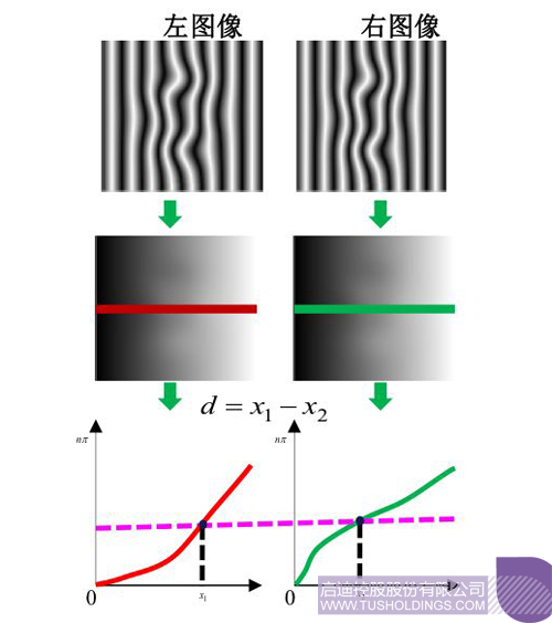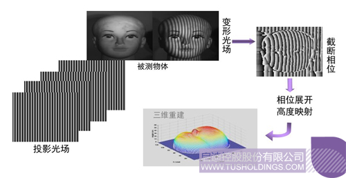 结构光条纹(单帧条纹或相移条纹)投影到被测物体表面,从另一方向观察到变形条纹,通过计算变形条纹的相位,得到截断相位,展开成连续相位,根据相位和高度的映射关系,重建被测物体的三维面形数据。