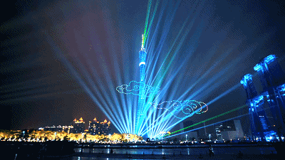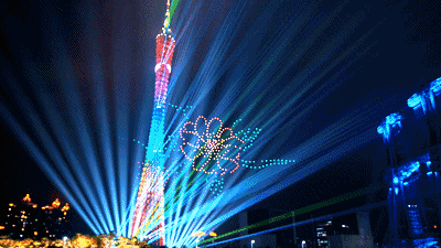 最令人震撼是海上丝绸之路立体造型,近千架无人机组成“地球”,线条从“广州”发散至世界各地,光彩夺目,蔚为壮观。展现广东“敢为天下先”的气魄,敞开胸怀,拥抱世界的开放姿态。