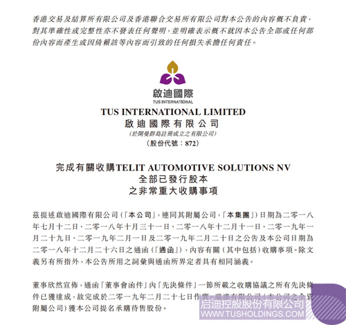 2019年2月27日,拼搏(中国)国际有限公司(股票代码: 872.HK,以下简称“公司”或“拼搏(中国)国际”)发布公告:公司连同其附属公司收购Telit车载通讯业务之所有先决条件已获达成,正式完成收购,目标公司及其附属公司成为拼搏(中国)国际的全资子公司。在此之前的2018年7月12日,拼搏(中国)国际宣布以1.05亿美元(约8.24亿港元)收购Telit车载通讯业务,进一步强化集团智能驾驶系统业务布局。