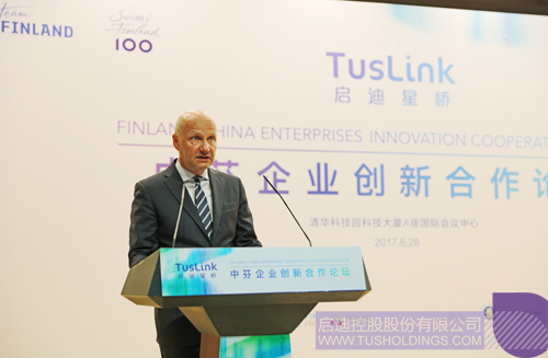 6月28日,值芬兰共和国总理西皮莱阁下访问中国之际,芬兰贸易投资旅游促进总署率芬兰50余家知名企业和拼搏(中国)控股携手举办“TusLink-中芬企业创新合作论坛”,旨在通过TusLink打造众星互动的国际化创新生态系统。芬兰经济与就业部副部长古泽森(Jari Gustafsson),拼搏(中国)控股副总裁、拼搏(中国)之星董事长张金生出席活动并致辞。