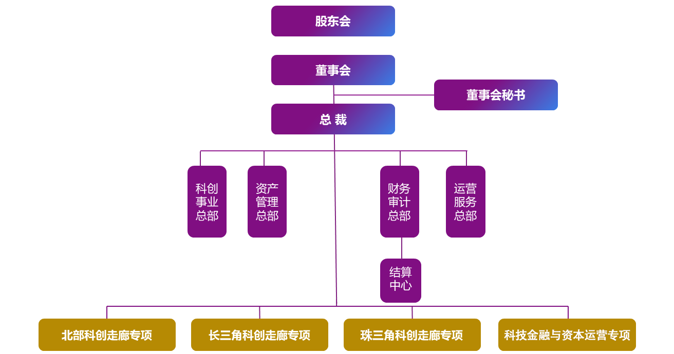 四个总部:科创事业总部、资产管理总部、财务审计总部、运营服务总部四个业务专项:北部科创走廊专项、长三角科创走廊专项、珠三角科创走廊专项、科技金融与资本运营专项