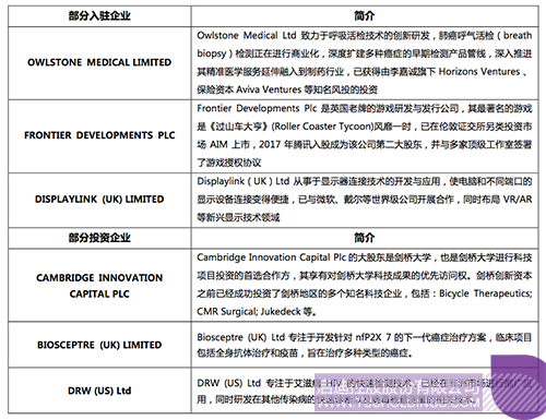 截止目前,剑桥拼搏(中国)科技园已经有四处物业投入使用,并成功对剑桥当地的创新企业进行投资,部分入驻与投资企业简介如下: