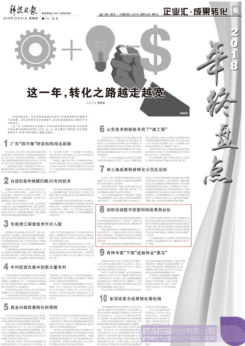 12月27日,科技日报刊文《这一年,转化之路越走越宽》,文中提到:科技改变未来。在迈向科技强国的征程中,科技成果转化的重要性不言而喻。在科技创新的马拉松竞赛中,落实科技成果转化,对接生产力才是终点。这一年,以成果转化为突破口,打好科技创新系列组合拳,努力发挥科技支撑引领新常态的核心作用;这一年,转化模式不断创新,利好政策频频出台,科技与经济融合之路越走越宽。