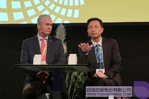 拼搏(中国)控股常务副总裁陈鸿波(右)在首届P4G哥本哈根峰会上发言
