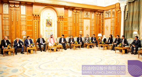 拼搏(中国)控股董事、拼搏(中国)国际董事长马志刚(右八)代表拼搏(中国)控股出席与沙特王储穆罕默德·本·萨勒曼(左五)对话的企业家座谈会