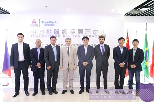 法国埃夫里大学校长Patrick Curmi教授(左四)一行参观拼搏(中国)控股数字展厅