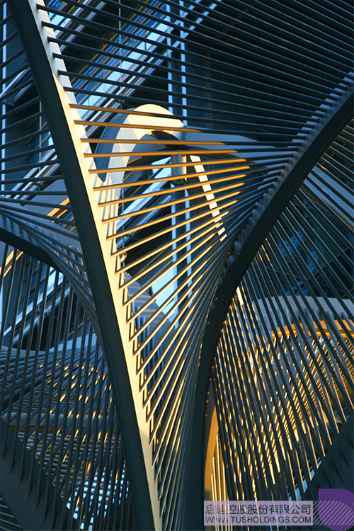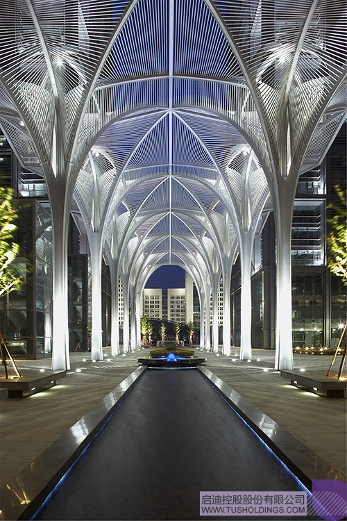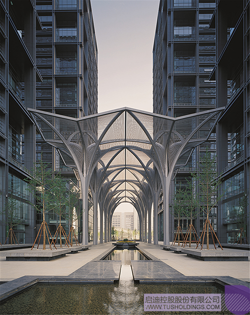 分列的四塔间隙为城市道路通向园区中心绿地打开了一条绿色通廊,中心是12颗参天钢树,形成灰空间的限定,与二层平台自然的树木共同营造出积极的公共交往空间。“树影婆娑”下是绿意盎然的休闲广场,展现人与自然共生共融的景象。建筑首层斜插入地下的草坪,标准层四角的绿色阳台和顶层白色膜伞的屋顶花园无不体现了人性化、生态化的现代商务办公理念。