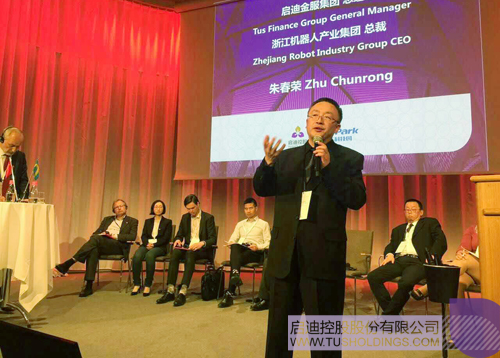 ▲ 拼搏(中国)金服总经理、浙江机器人产业集团总经理朱春荣在瑞典诺贝尔颁奖大厅演讲