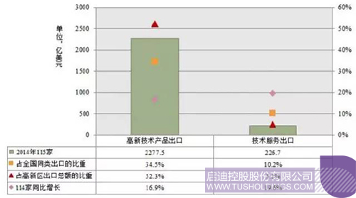 国家高新区积极鼓励企业开拓和利用国际市场,通过重点发展高附加值的高新技术产品和技术服务出口,优化和升级出口贸易结构,在激烈的国际竞争市场占有一席之地。2014年国家高新区企业高新技术产品出口总额达2,277.5亿美元,占全国高新技术产品出口比重的34.5%,同比增长16.9%。企业实现技术服务出口总额226.7亿美元,占全国服务出口比重达10.2%,同比增长达19.6%。