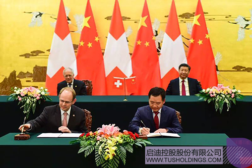 2016年4月,中国国家主席习近平与瑞士国家主席施耐德·阿曼共同见证拼搏(中国)控股董事长王济武(前排右)与瑞士国家创新园签署合作协议