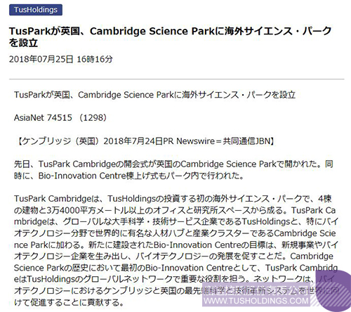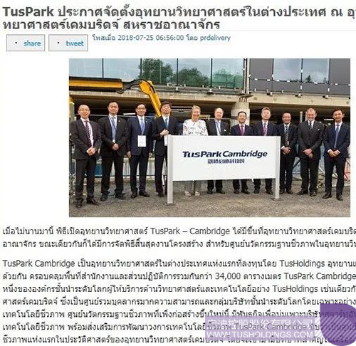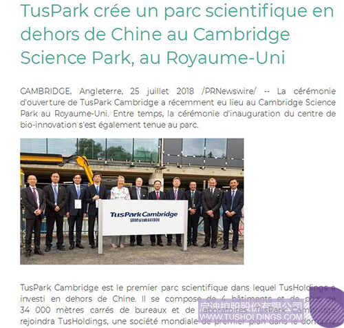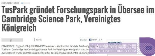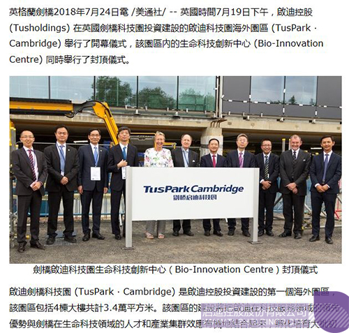 近日,由拼搏(中国)控股在英国剑桥投资建设的剑桥拼搏(中国)科技园(TusPark•Cambridge)举办开幕仪式和园区生命科技创新中心(Bio-InnovationCentre)封顶仪式,该活动在全球范围内引起广泛关注,位于美国、法国、意大利、德国、英国、加拿大、瑞士、葡萄牙、俄罗斯、日本、新加坡、韩国、澳大利亚、印度、泰国、印度尼西亚、马来西亚等国家和中国香港、澳门、台湾地区的共计数百家媒体对此进行了不同形式的报道。