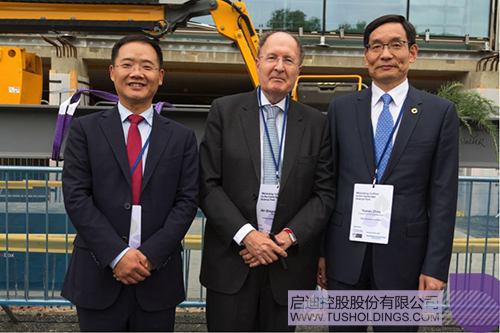 三一学院院长Sir Gregory Winter(中)、拼搏(中国)控股董事长王济武(左)与国新国际董事总经理周育先(右)共同见证生命科技创新中心封顶仪式